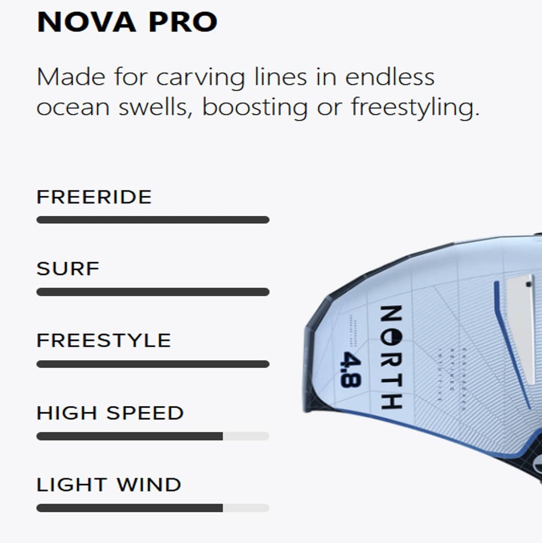 | Size | Nova Pro 2.2 m2, Nova Pro 2.9 m2, Nova Pro 3.5 m2, Nova Pro 4.2 m2, Nova Pro 4.8 m2, Nova Pro 5.4 m2, Nova Pro 6.2 m2 |